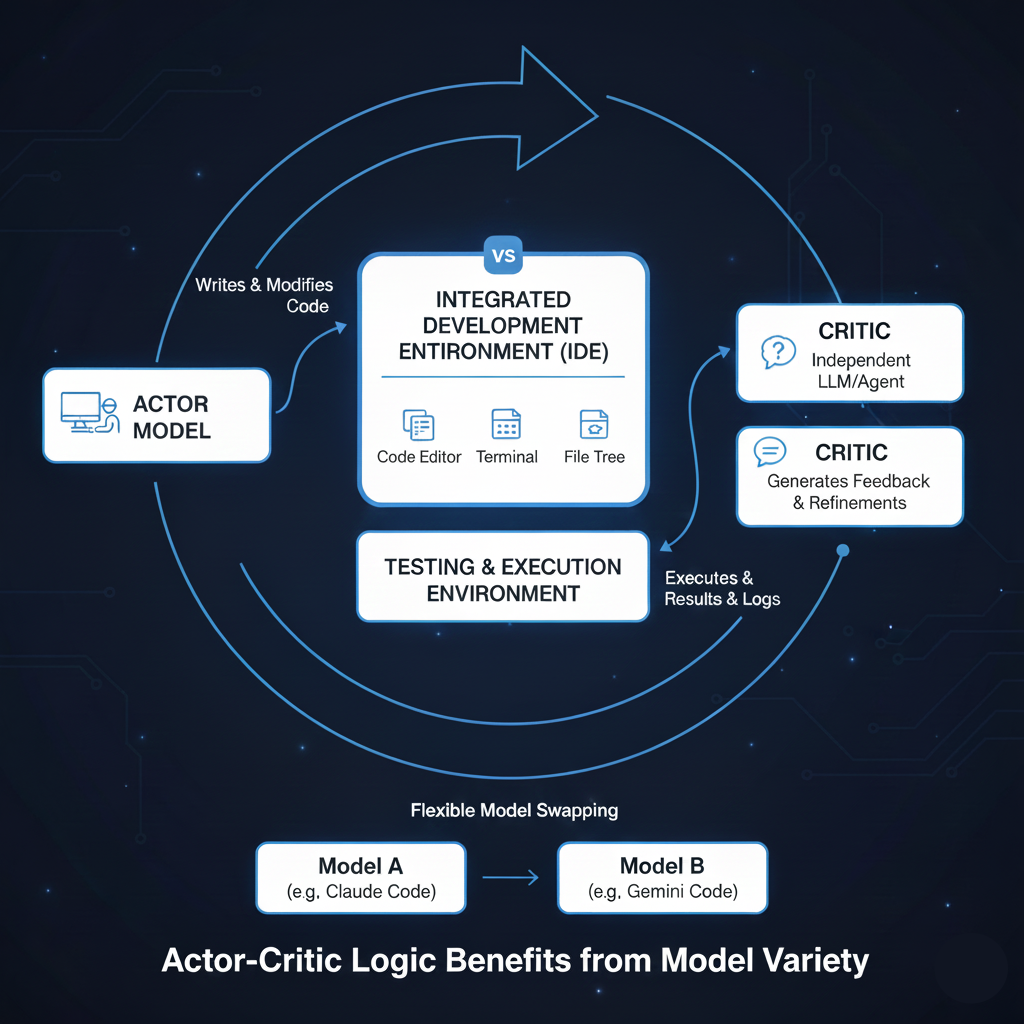 While “racing” parallel agents is becoming standard practice (see the Cursor documentation), I also use a sequential approach with diverse models: e.g., using Claude to code (the actor) and Gemini to review (the critic). VS Code documentation on agent use touches on this “multi-agent” idea without calling it an “actor-critic” setup (rightly so, as I’m just borrowing the concept from reinforcement learning).