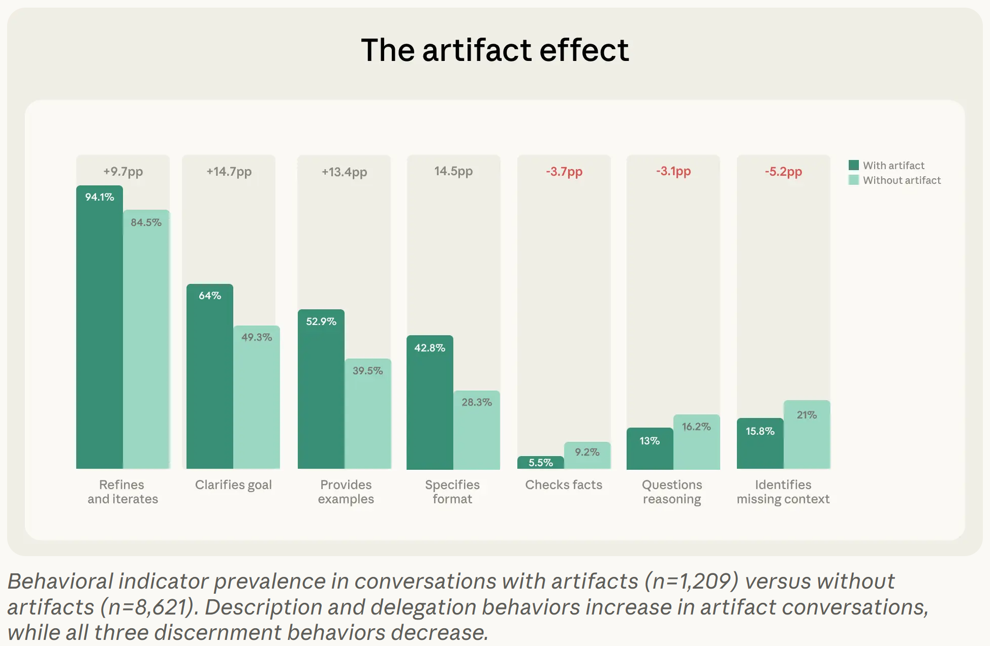 When AI produces artifacts (apps, code, documents, visuals, or interactive tools), users are significantly less likely to verify the work: